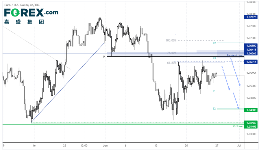 4小时图继续震荡,附近仍然筑有多个关键阻力。受制于1.0600,我们考虑看跌结构,目标1.0400。不过,即使站上1.0600,我们还是寻找1.0650阻力密集区域下方的看跌结构。
