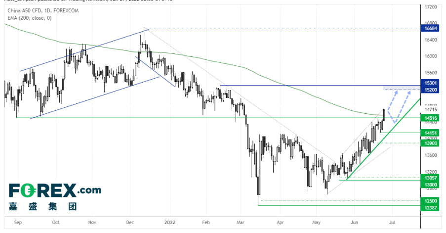 中国A50指数日图保持强有力的上涨势头,上周五逼近3个月高点,也收上9月低点和200天指数移动均线,并且上涨通道保持完好。上周五的高点测试了通道上轨,继续冲高前或先行回调,可能在14,516低点和下轨趋势线找到支撑。但若站上上周五高点,可以假设继续冲高,重点关注15,200阻力区域。
