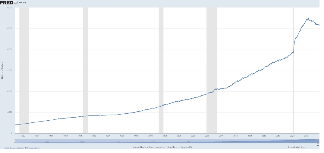 这是美国M2货币供应量,它跟踪流通中的现金以及易于转换为现金的存款产品。
