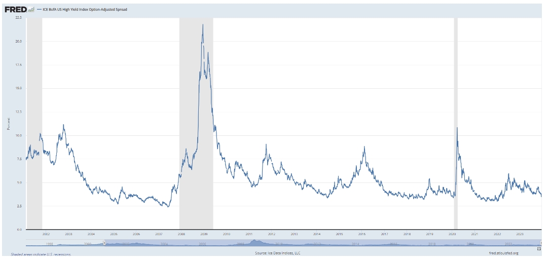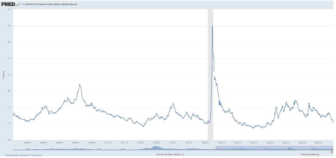 以下是一篮子具有投资信用评级的美国公司债券与美国政府借贷成本的利差(或称为溢价)。