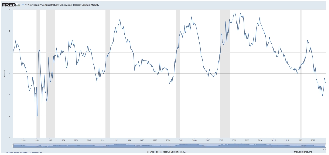 这是美国10年期国债收益率减去美国2年期国债收益率,这可能是金融市场上最广泛引用的衰退指标。