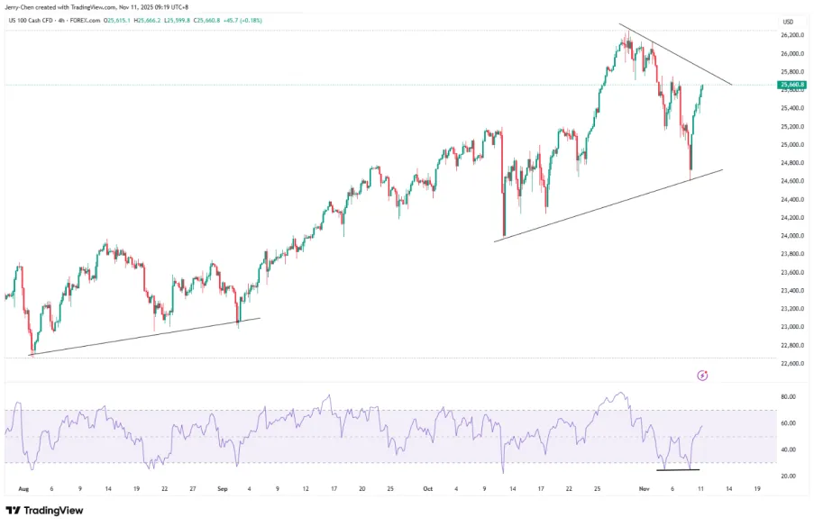 美国政府若重新开门后市场流动性有望回归,与此同时特朗普甚至表示考虑向大部分美国民众发放2000美元的“关税分红”,乐观情绪有望在本周初继续刺激纳斯达克100指数上行。