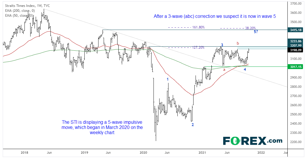 本文来自于嘉盛集团特别供稿,外汇及CFD交易可能会为您的投资带来机会与风险。 随着新加坡TI(海峡时报)指数涨势逼近关键阻力水平,我们来观察下其长线技术面形势。 周线图上可以看到,TI指数正落在始于2020年3月低点的5浪推高走势之内。第三浪于127.2%斐波拉契扩展位和2020年2月高点停滞,或已自此完成三浪调整。鉴于