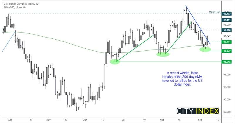 本文来自于嘉盛集团特别供稿,外汇及CFD交易可能会为您的投资带来机会与风险。 昨晚标普500指数和道指连续第三个时段收低,初步暗示9月下跌的季节性趋势可能再度上演。 道指似乎是美国三大股指中下探意愿最强的一个,此前连续第二天收于2020年3月低点以来的上涨趋势支撑位下方。 外汇市场方面,美元指数受益于过去三