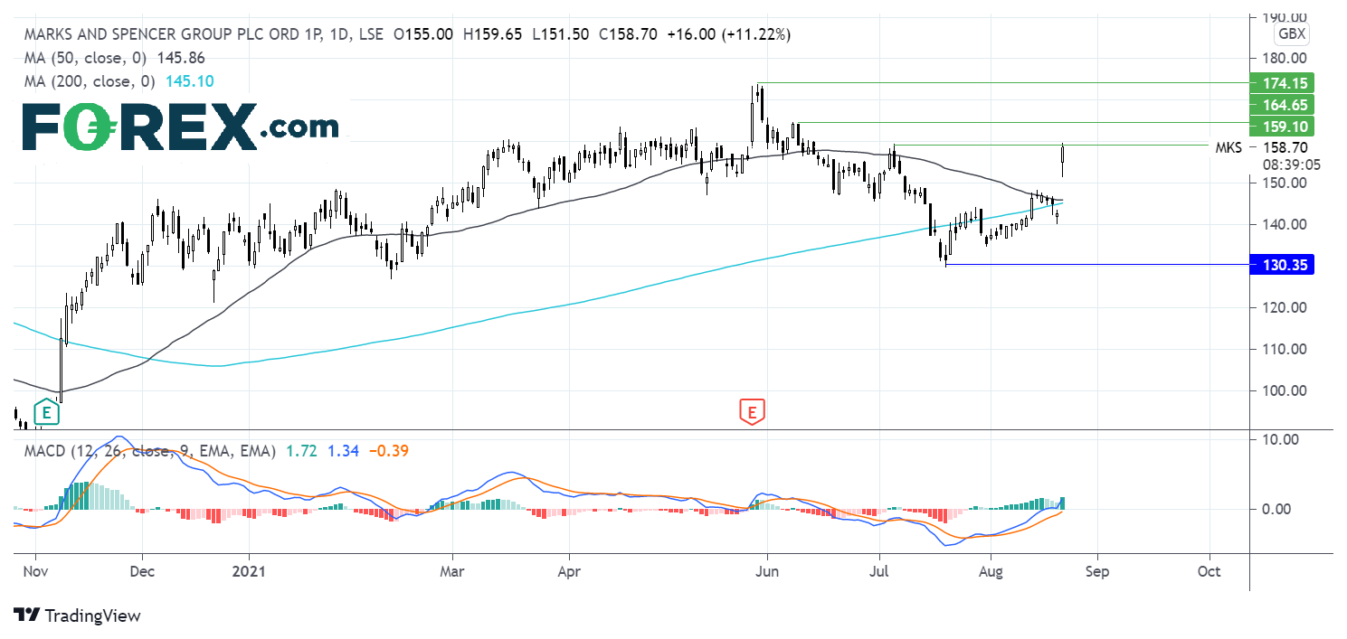 本文来自于嘉盛集团特别供稿,外汇及CFD交易可能会为您的投资带来机会与风险。 头条新闻:玛莎百货销售额超过疫情前水平,提高预期 玛莎百货(a)表示,预计今年利润将达到预期上限。由于受抑需求释放加之美食广场表现强劲,最近几周销售额超过疫情前水平。 该公司预计截至2022年3月底当前财政年度,调整后运营利润将