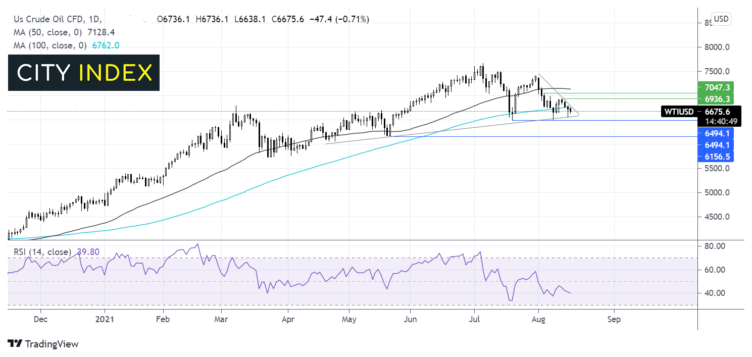 本文来自于嘉盛集团特别供稿,外汇及CFD交易可能会为您的投资带来机会与风险。 原油失地扩大 原油价格持续承压,遭遇四连跌。油价在今年前6个月上涨了约40%,但本月迄今下挫了约10%。 今年上半年,围绕需求前景的乐观情绪推高油价,但德尔塔毒株病例上升和中国经济复苏放缓引发的担忧同样不容忽视。中国是世界第二大
