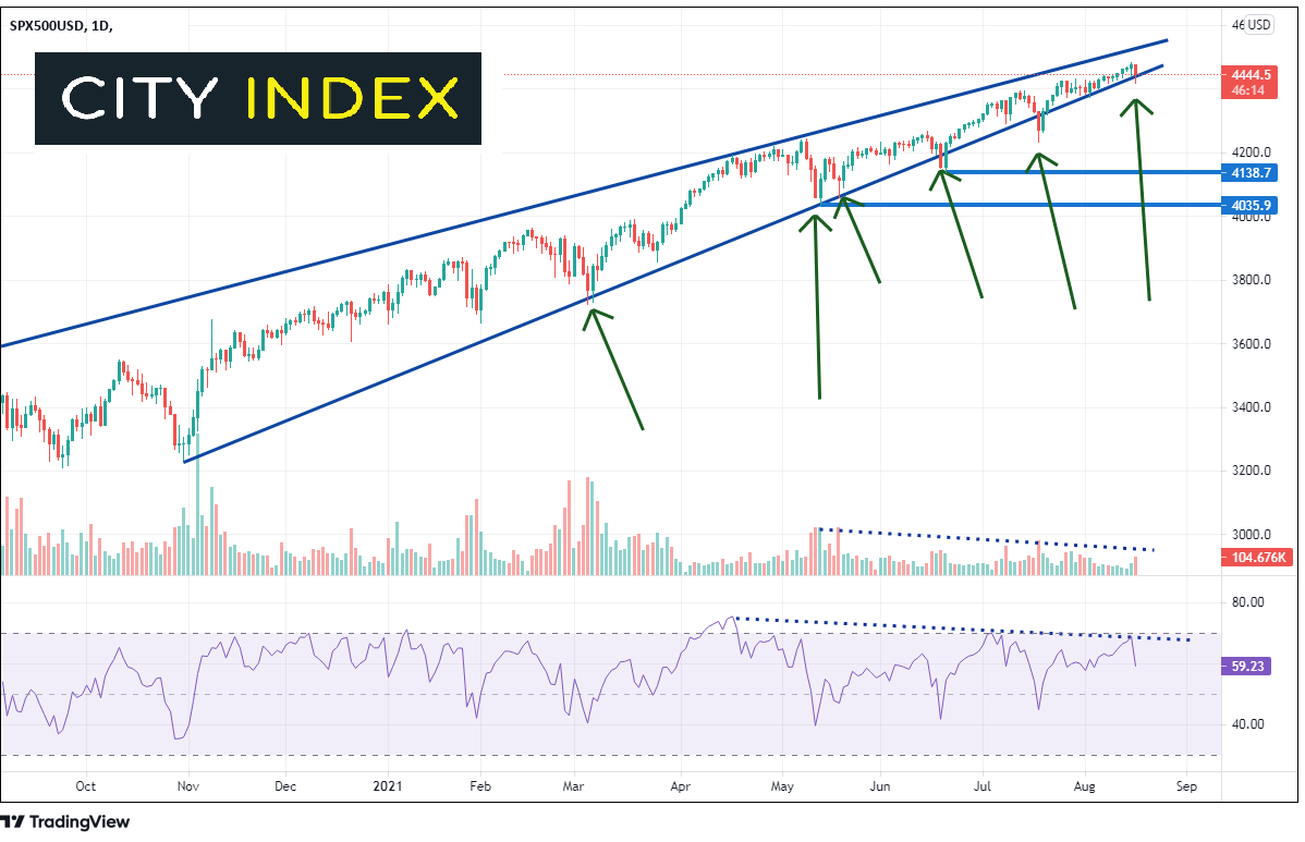 本文来自于嘉盛集团特别供稿,外汇及CFD交易可能会为您的投资带来机会与风险。 标普500指数周一暴跌,只是后来反弹并且当天收高。周二,该大盘股指数走势相似,只是虽有晚些时候美联储官员Kahkari讲话的激励,也没能反弹且当天收低。后市会不会继续下跌?周一,我们遭遇疲弱的中国经济数据和阿富汗地缘政治噩梦。周二,