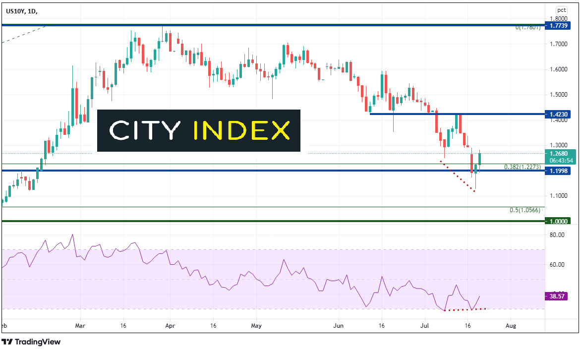 本文来自于嘉盛集团特别供稿,外汇及CFD交易可能会为您的投资带来机会与风险。 美国10年期债券殖利率昨天跌至2月以来最低点1.129,之后调头向上并收高于1.223,在日图上留下一根带着长下影线的小实体阳线,即所谓的锤子形态,构筑底部。(理想情况下,锤子的影线应该是实体长度的2-3倍。)昨天,殖利率收盘价回到水平支