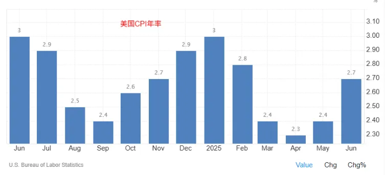 特朗普本周开始对中小经济体发出最新的关税信函。根据YalBudgtLab最新估算,美国目前的有效平均关税税率已经升至20%,这是1933年以来的最高水平。而在特朗普第二任期开始之前,该税率仅为3%左右。正因如此,对通胀的担忧始终存在。 美国6月CI同比增长2.7%符合预期,高于前值2.4%。核心CI从2.8%升至2.9%,低于预期的3%,