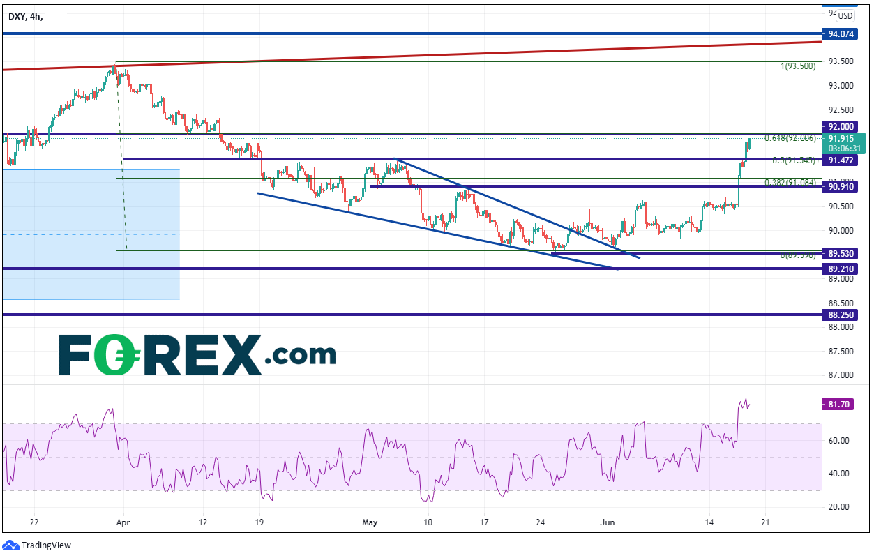 本文来自于嘉盛集团特别供稿,外汇及CFD交易可能会为您的投资带来机会与风险。 联邦公开市场委员会(FOC)昨天的会议结果显示,美联储委员预测中值为2023年底前加息2次(自0次上升),美元获撑大幅走高。美元指数逼近FOC会前水平90.50略上方下降楔形50%回档水平。但随后,美元指数一路攻向楔形目标91.48。今天,指数继续