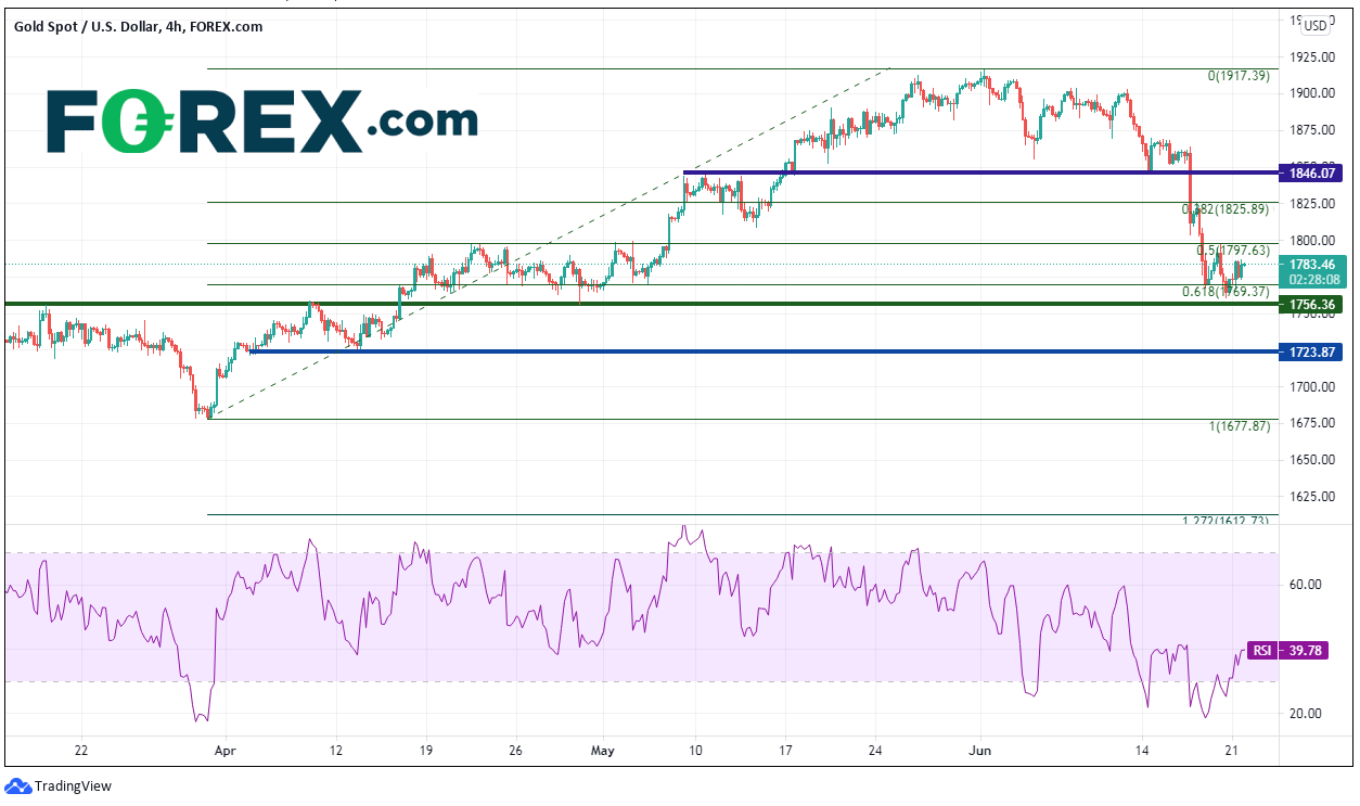 本文来自于嘉盛集团特别供稿,外汇及CFD交易可能会为您的投资带来机会与风险。 场景:FOC日。现货黄金/美元回撤,自6月1日1917.39附近的近期高点下挫60美元左右,目前报在1856附近。FOC发布其6月声明以及成长与通胀预测:强硬。黄金暴跌,自1859大跌至1803,而且第二天延续跌势,至1767。 但金价已止步于此,并且一直