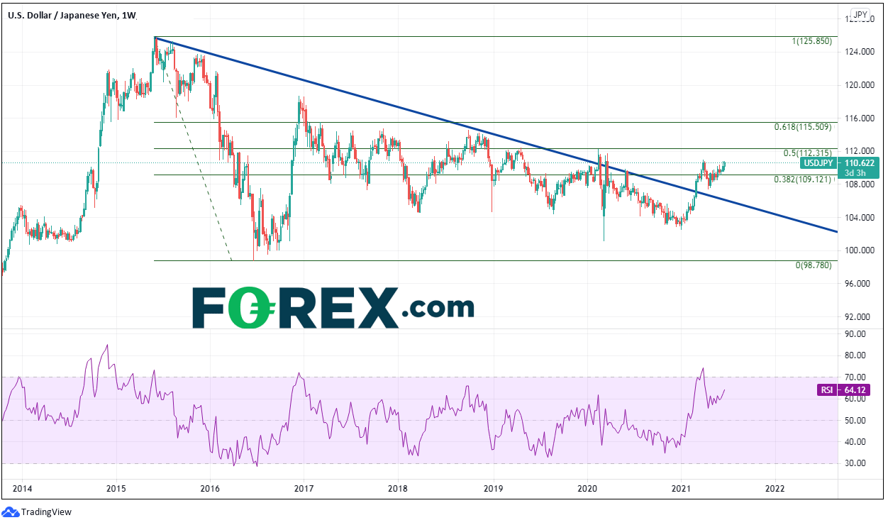 本文来自于嘉盛集团特别供稿,外汇及CFD交易可能会为您的投资带来机会与风险。 美元/日元似乎准备突破3月高点110.97 美元/日元曾于2015年6月初触及125.86高点。然而,仅仅一年后,汇价就跌入98.79低点!美元/日元此后一直在该区间内震荡,一路构筑高点降低。在2020年2月和3月疫情爆发之初,美元/日元试图升穿高点以来下