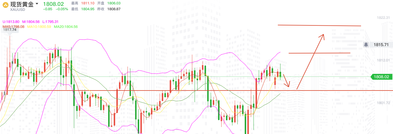 黄金,下午出现上涨,我判定为“假突破”,如图: 一旦出现假突,其反向力度会更大,所以,今晚我看跌金价。 我认为,可在当前1810附近,做空黄金。实时进出场点位可咨询指点金油:zx88615