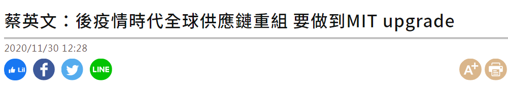 台湾地区领导人蔡英文在今天(11月30日)就后新冠疫情时代发表讲话,她指出台湾在应对全球供应链重组的变局中将再次擦亮“台湾制造”(adInTaiwan)的招牌,更要结合各领域的创新能力达到“台湾制造”再升级,为台湾寻求更广大的市场与国际合作机会。她也强调,台湾今年第三季度稳居亚洲四小龙第1名,经济成长率达到3.33%,