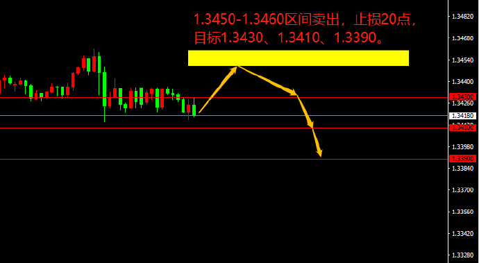 1.3450-1.3460区间卖出,止损20点,目标1.3430、1.3410、1.3390。