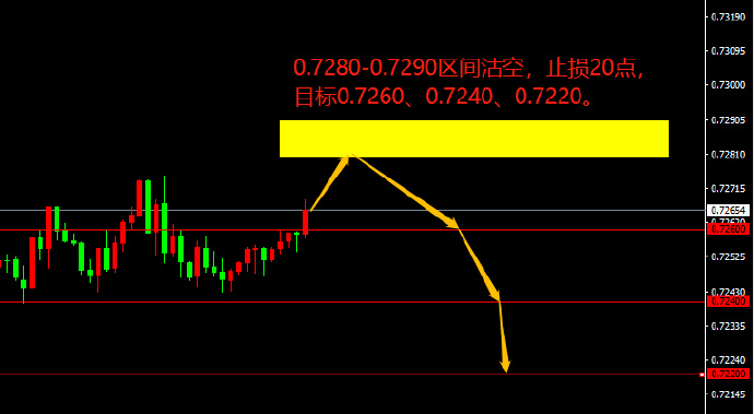 0.7280-0.7290区间沽空,止损20点,目标0.7260、0.7240、0.7220。