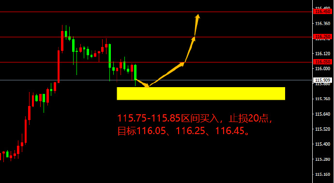 115.75-115.85区间买入,止损20点,目标116.05、116.25、116.45。