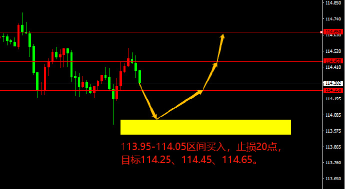 113.95-114.05区间买入,止损20点,目标114.25、114.45、114.65。