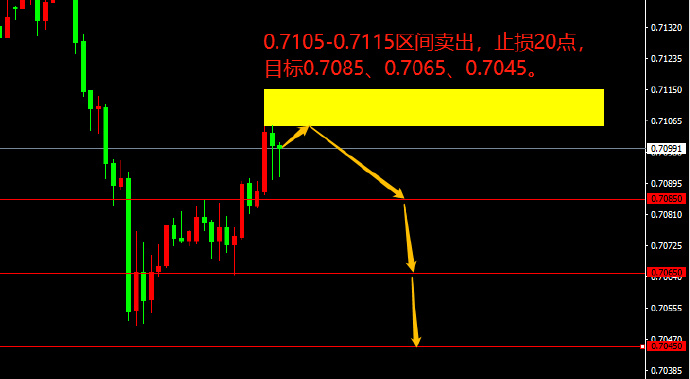 0.7105-0.7115区间卖出,止损20点,目标0.7085、0.7065、0.7045。