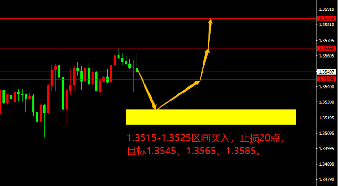 1.3515-1.3525区间买入,止损20点,目标1.3545、1.3565、1.3585。
