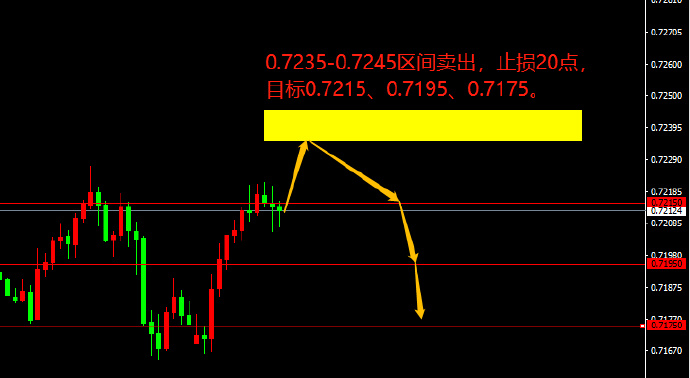 0.7235-0.7245区间卖出,止损20点,目标0.7215、0.7195、0.7175。