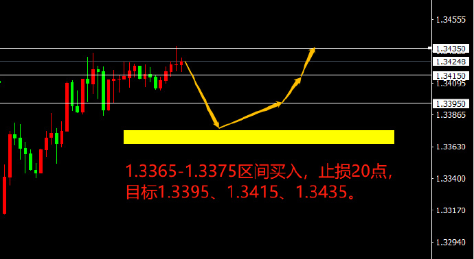 1.3365-1.3375区间买入,止损20点,目标1.3395、1.3415、1.3435。