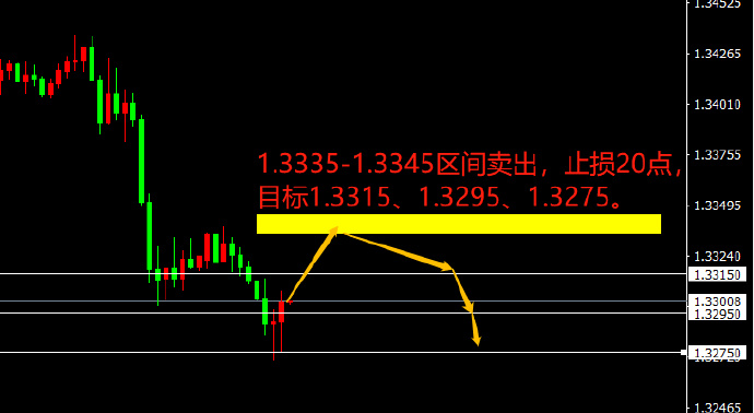 1.3335-1.3345区间卖出,止损20点,目标1.3315、1.3295、1.3275。