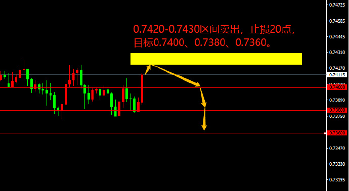 0.7420-0.7430区间卖出,止损20点,目标0.7400、0.7380、0.7360。