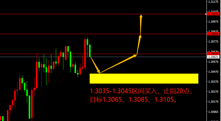 1.3035-1.3045区间买入,止损20点,目标1.3065、1.3085、1.3105。