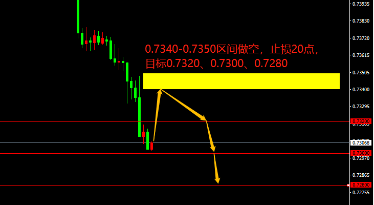 0.7340-0.7350区间做空,止损20点,目标0.7320、0.7300、0.7280