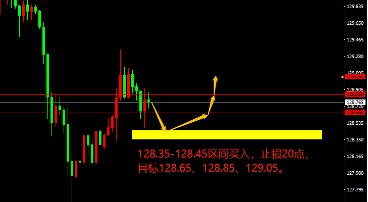 128.35-128.45区间买入,止损20点,目标128.65、128.85、129.05。