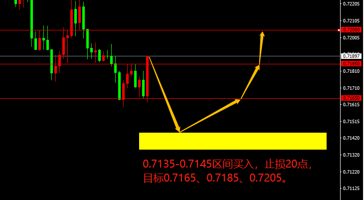 0.7135-0.7145区间买入,止损20点,目标0.7165、0.7185、0.7205。