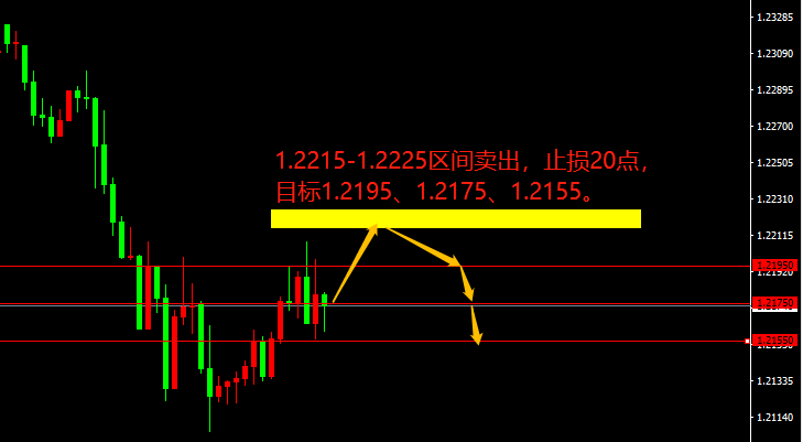 1.2215-1.2225区间卖出,止损20点,目标1.2195、1.2175、1.2155。