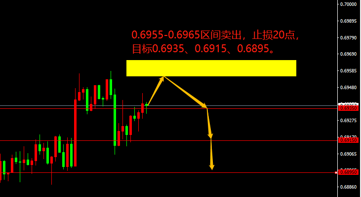 0.6955-0.6965区间卖出,止损20点,目标0.6935、0.6915、0.6895。