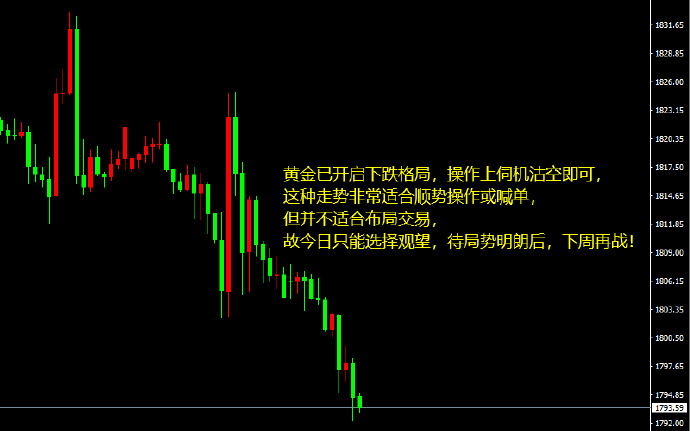 黄金已开启下跌格局,操作上伺机沽空即可,这种走势很适合顺势操作或喊单,但并不适合布局交易,故今日只能选择观望,待局势明朗后,下周再战!