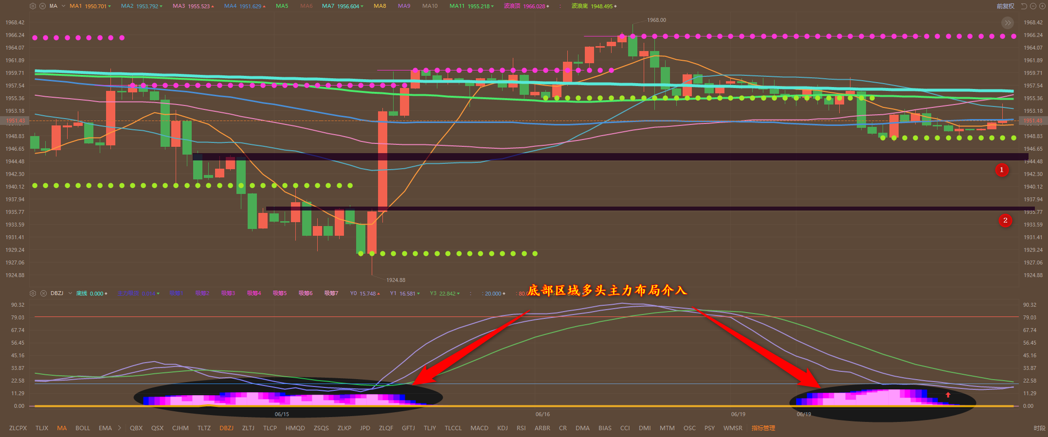 通过对黄金小时图解析得知,昨日行情继续延续下跌走势晚间在下方1947.5一线止跌反弹,从的下方的幅图我们可以清楚的看到,到达下方的底部区域再次出现了多头主力布局建仓信号并且短期强势非常有可能由下跌转为上涨,目前还需要进一步的确认,短期下方12号的支撑依然是我们重点关注的有效支撑,上方1967和1984依然是关键压力,短期在操作上我们暂且继续高空低多思路,具体建议如下: