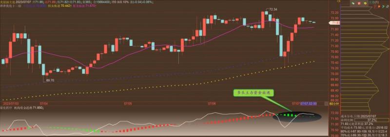 通过对原油小时图解析得知,昨日行情先涨后跌再上涨在盘中形成剧烈的波动,我们从下方的幅图可以清楚地看到在反弹的高位有多头主力资金出逃迹象,目前虽然有反弹动作但是整体主力资金已经走弱反弹的动能不足,有进一步回落的可能性短期上方72.30和73.20依然是重要压力,下方70.50和6940是短期的支撑,虽然有支撑但是短期改变不了弱势的命运,突发事件除外,短期在操作上我们暂且先继续高空低多思路,具体建议如下: