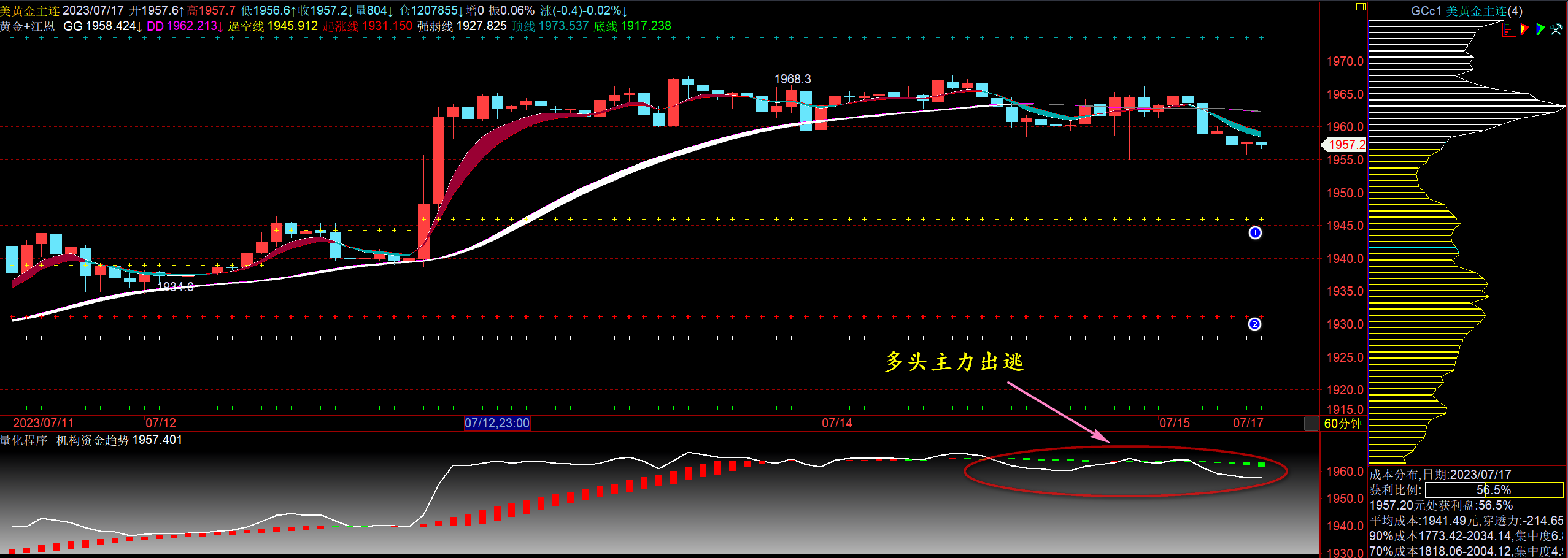 通过对黄金小时图解析得知,上一个交易日行情如期在高位冲高回落,我们从下方的幅图可以清楚地看到上一个交易日行情在高位横盘震荡调整期间多头主力已经出现了拉高出货动作多头的力道明显不足短期下方我们重点关注12号平台的支撑区间,上方我们继续重点关注1968一线的压力,短期继续回落调整的可能性大一点,短期在操作上我们继续高空低多思路,重点逢高空,具体建议如下: