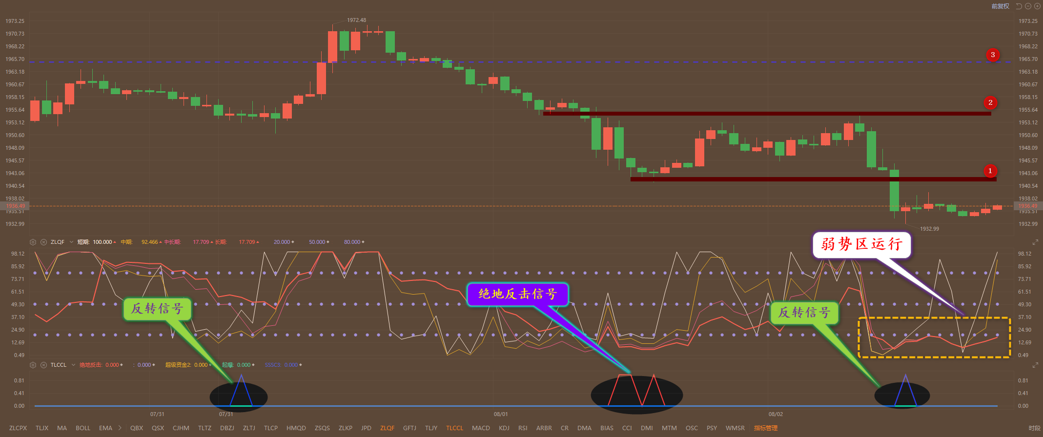 通过对黄金小时图解析得知,昨日黄金反弹到上方1955一线冲高回落晚间放量跌破1941的支撑,到达下方1933一线出现了止跌反弹动作,目前依然弱势盘整,我们从下方的2张幅图可以清楚地看到前一天晚间在下方出现了绝地反击信号行情反弹了一波,昨日晚间在1933一线出现了阶段性反转信号,在前期回调的底部区域出现反转信号相对而言反弹了20美金左右,就看这次反弹的力度,短期上方我们重点关注123号的压力即可,下方1929和1915依然是短期的重要支撑,在操作上我们继续高空低多思路,具体建议如下: