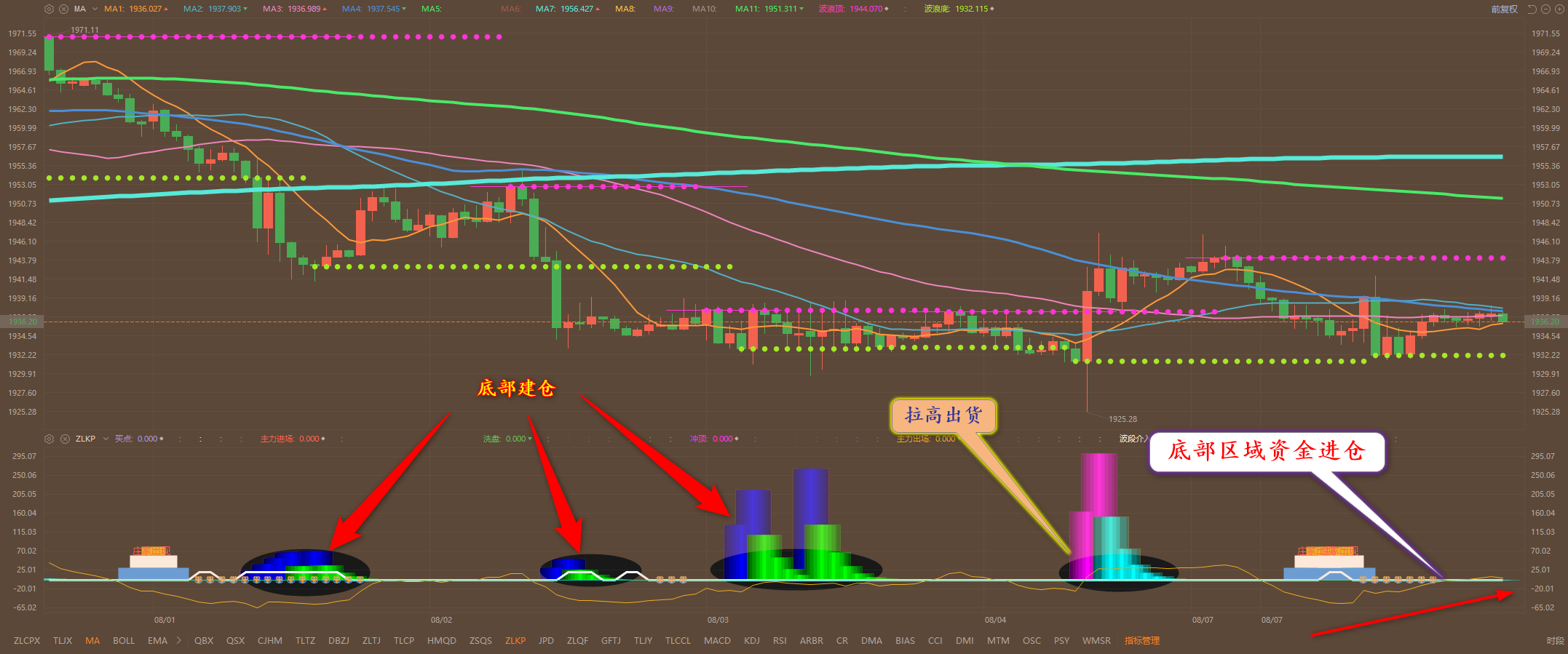 通过对黄金小时图解析得知,昨日行情冲高回落到达下方1932一线止跌反弹,我们通过下方的幅图可以清楚地看到在每次的阶段性底部区域都出现了多头主力建仓信号建仓的位置既是支撑也是压力这也是为什么昨日冲高回落的原因,上周五晚间有拉高出货动作,昨日晚间我们再次发现有部分主力资金进仓信号,上方1944和1951以及1959依然是压力,短期在操作上我们相聚高空低多思路,具体建议如下: