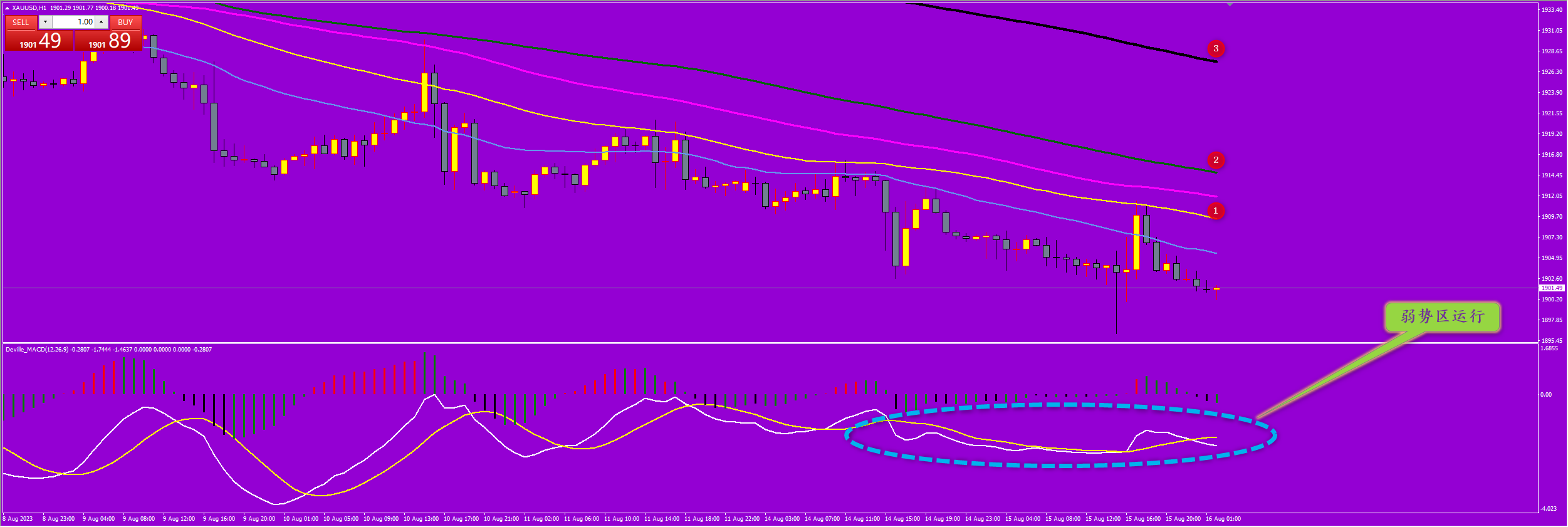 通过对黄金小时图解析得知,昨日行情先跌后涨在下跌,昨日美盘时间段下探到1896一线受到主要均线的支撑急速反弹,到达上方1号均线压力位冲高回落,目前再次到达下方1900一线相对而言应该是要继续横盘震荡调整运行,我们从下方的MACD 可以清楚地看到虽然下跌绿色动能柱有所缩短,但是依然是在零轴下方运行短期整体表现属于弱势反弹行情,上方均线系统依然是空头排列短期保持下降走势,短期在操作上我们继续高空低多思路,具体建议如下: