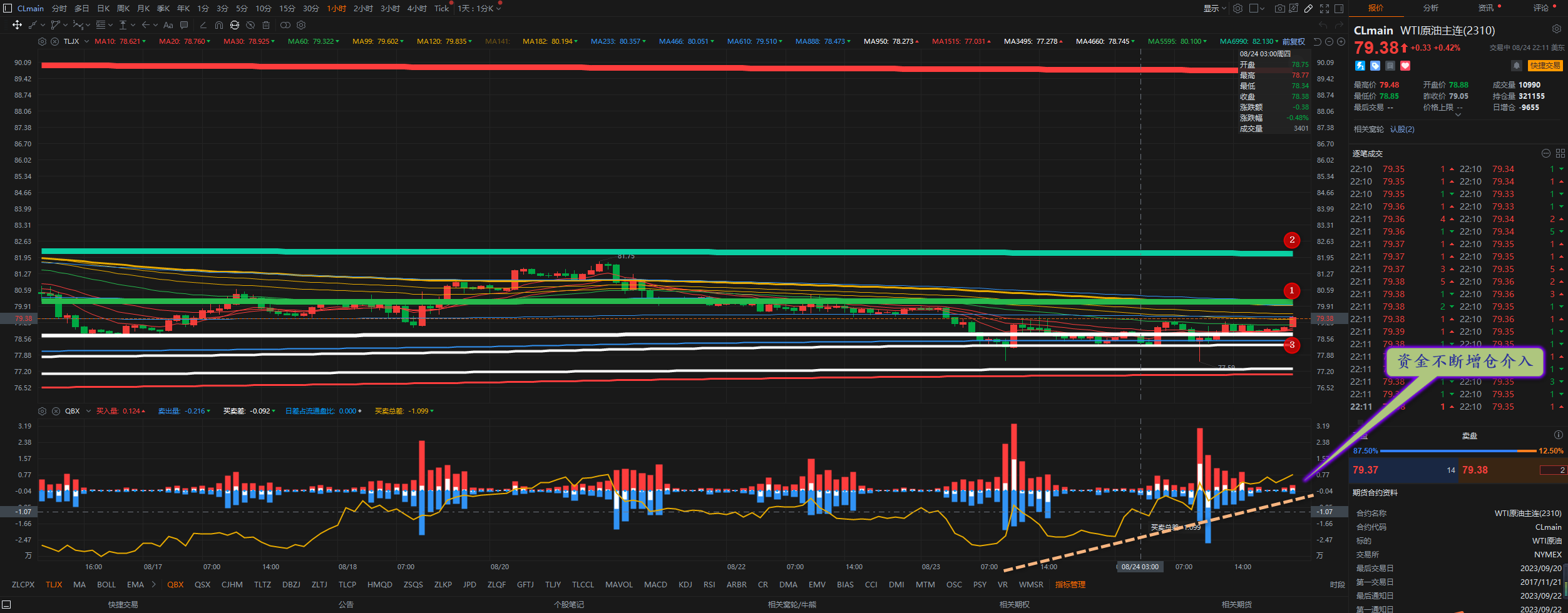 通过对原油小时图解析得知,近两个交易日在下方窄幅震荡调整形成双针探底形态,我们从下方附图可以清楚的看到行情在下方横盘震荡期间多头主力资金大量的介入,短期上方我们重点关注12均线的压力,下方我们重点关注3号均线的支撑,小妹个人认为行情进一步反弹的可能性比较大,短期在操作上我们继续高空低多思路,重点逢低做多,具体建议如下: