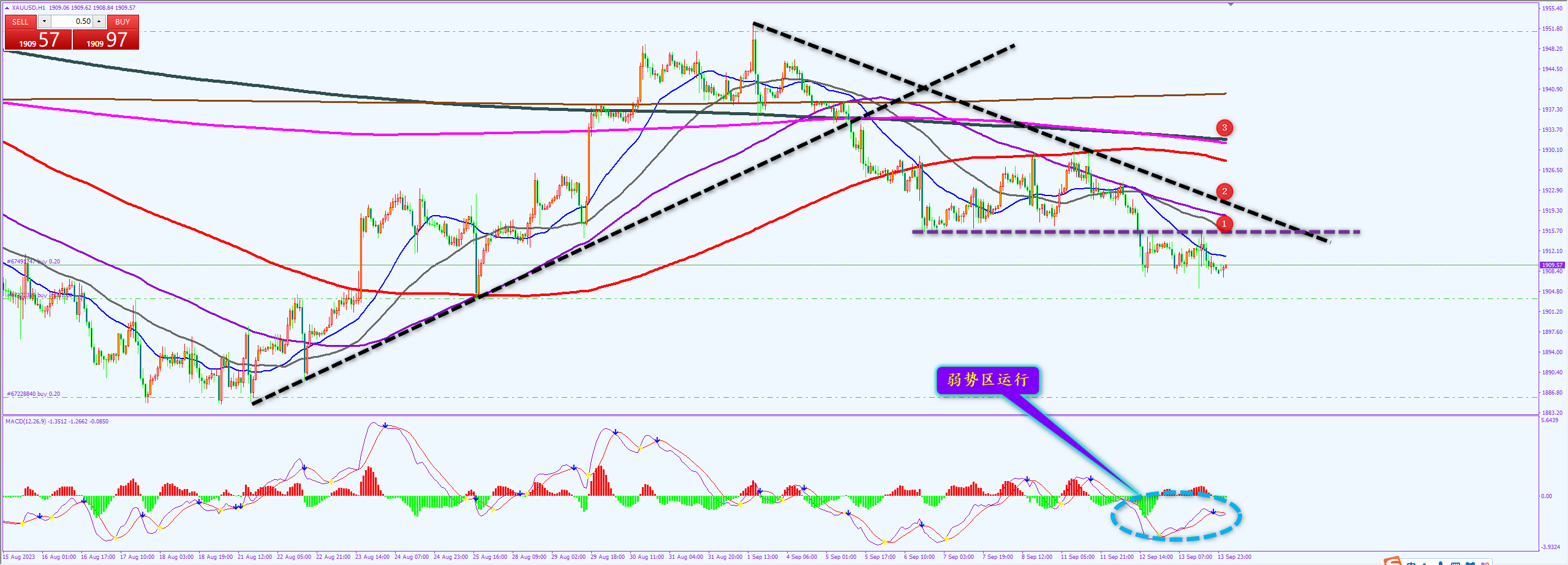 通过对黄金小时图解析得知,昨日行情继续维持弱势盘整走势,自从上方在1935一线的趋势线支撑,近期一直沿着下降趋势线以及均线系统震荡下行,我们从下方的MACD也可以清楚地看到在下方出现底背离迹象虽然一直是在弱势区运行短期上方一直受到123号的压制,一旦盘中受数据影响放量突破2号下降趋势线的压制非常有可能继续回归震荡上行走势,在在操作上我们继续高空低多思路,具体建议如下: