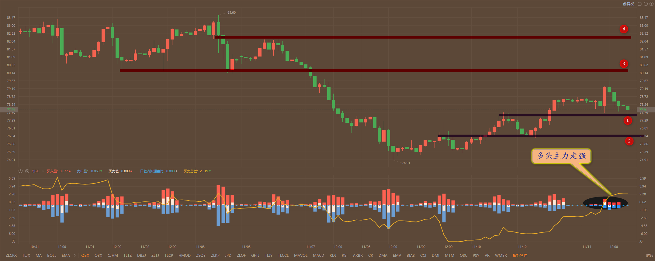 通过对原油2小时图解析得知,昨日行情继续延续反弹走势晚间到达上方79.70一线冲高回落,目前再次回到前期放量突破的位置1号位,我们从下方的幅图可以清楚地看到整体资金流已经进入强势区运行有继续向上突破的可能性,短期下方我们重点关注12号的支撑即可,以及上方34号的压力,预计将会继续向上反弹,短期在操作上我们继续高空低多思路,具体建议如下: