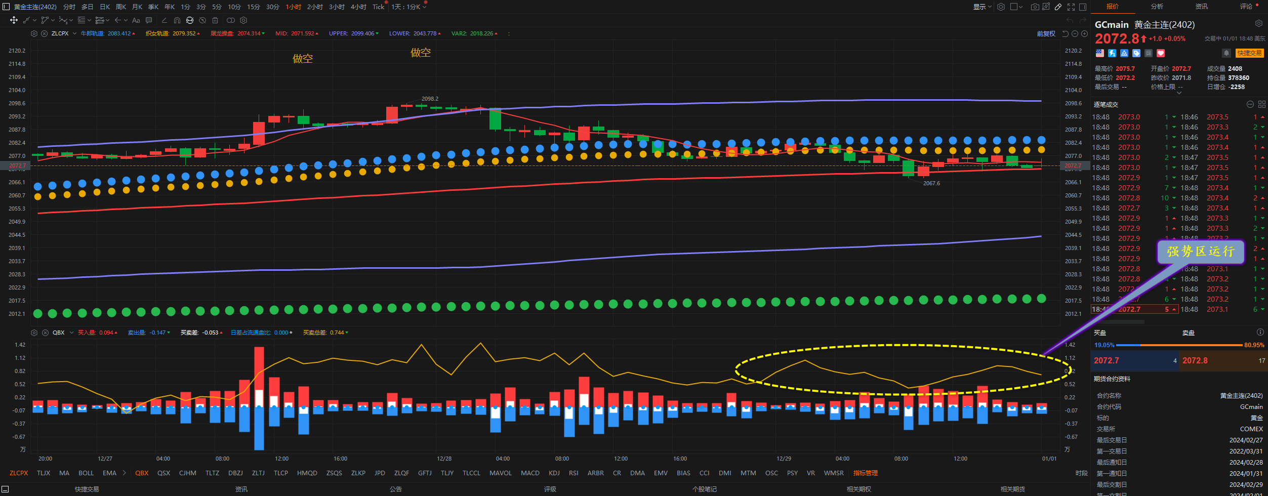 通过对黄金小时图解析得知,上一个交易日先涨后跌,行情在上方双轨的压力位受阻回落,在下方布林带的支撑小幅反弹,今日开盘小幅高开,我们从下方的附图可以清楚的看到整体市场资金流依然是在强势区运行说明短期几个交易日的回落属于强势调整,短期行情依然依托布林带中轨继续震荡上行不排除下探2050一线的支撑,短期在操作上我们暂且先继续高空低多思路,具体建议如下: