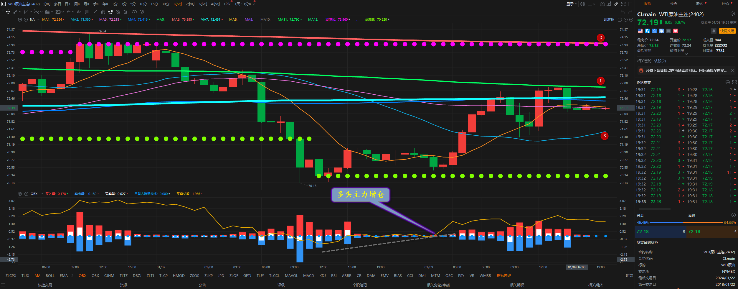 通过对原油小时图解析得知,昨日行情一路反弹如期到达上方1号均线的压力位受阻回落,我们从下方的附图可以清楚的看到在底部区域横盘震荡的时候多头主力不断地增仓介入从而导致行情的一路高歌,下方的资金流依然是处于流入状态,目前依然在高位小幅调整,短期我们重点关注12号均线的压力,下方我们重点关注3号均线的支撑。短期继续向上反弹的可能性比较大,在操作上我们继续高空低多,重点逢低做多,具体建议如下: