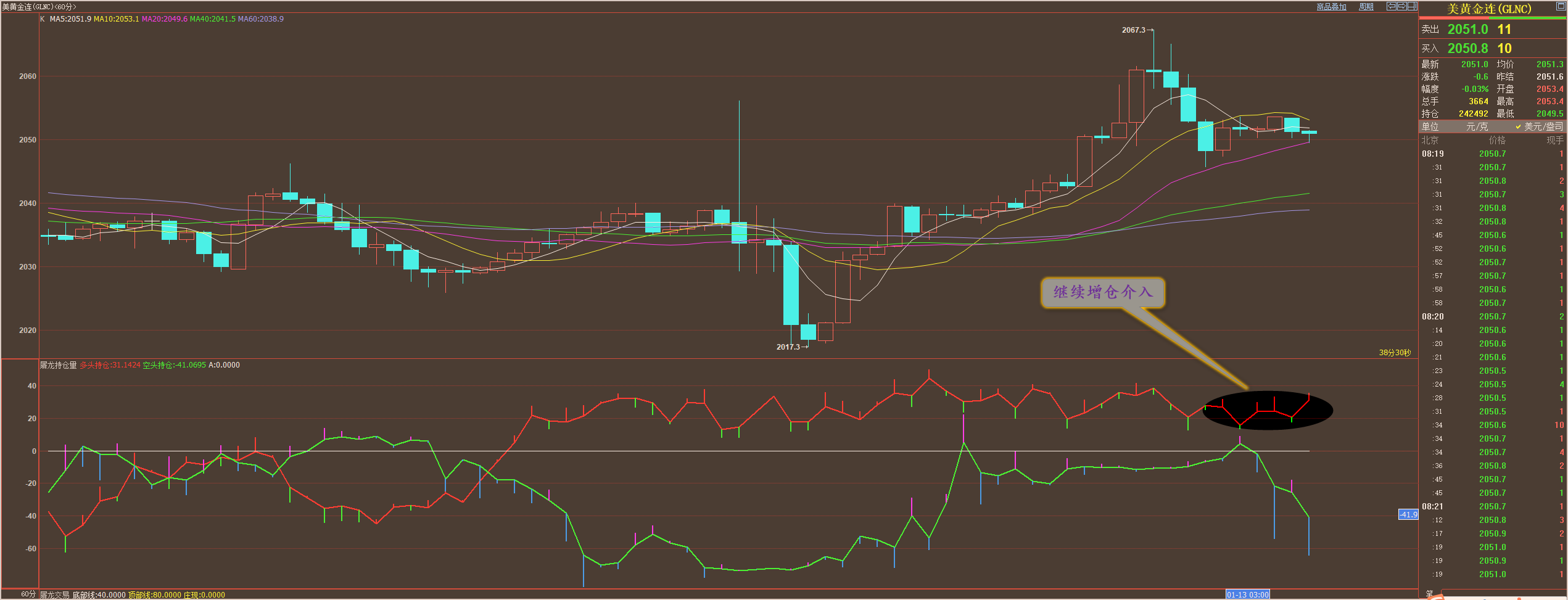 通过对黄金小时图解析得知,上一个交易日黄金先涨后跌,整体继续延续上涨走势,我们从下方的附图可以清楚的看到在横盘震荡调整期间多头主力再次增仓介入并且在下方20日均线的位置得到了有效的支撑说明行情还要继续向上运行,短期上方我们继续关注2063一线的阻力位,下方我们继续重点关注2041一线的支撑,短期在操作上我们继续高空低多思路重点逢低做多,具体建议如下:
