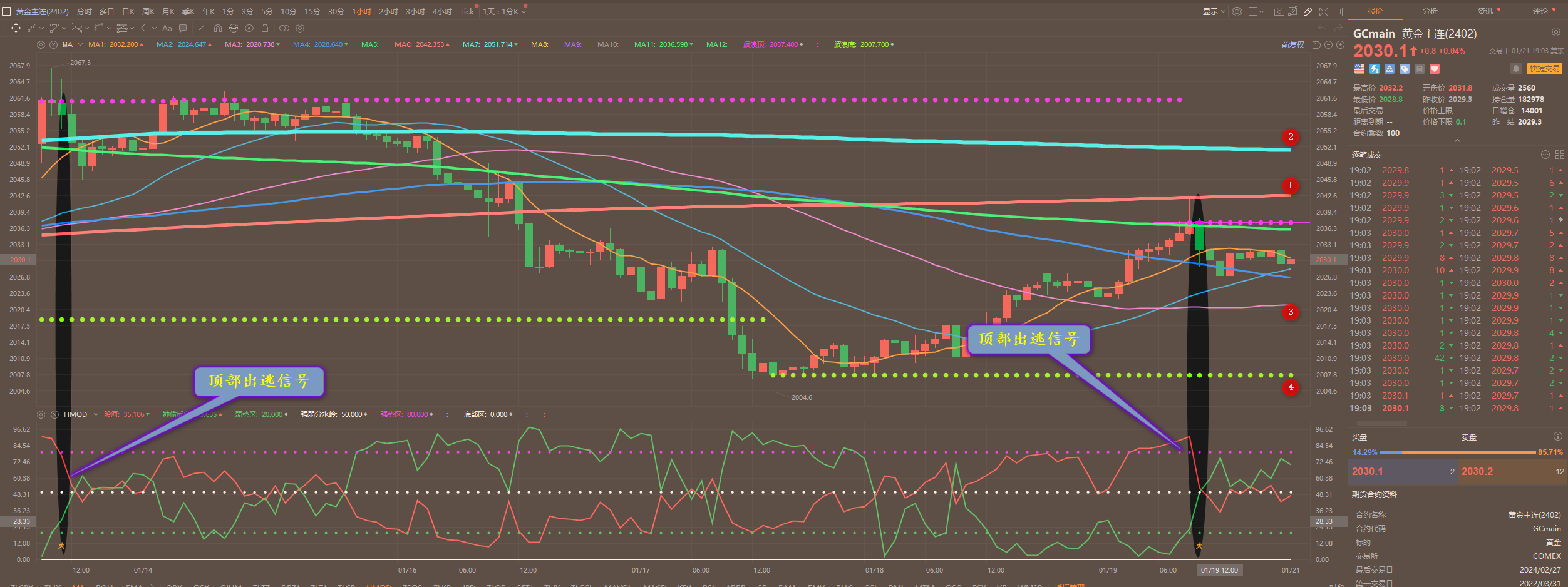通过对黄金小时图解析得知,上一个交易日先涨后跌晚间反弹到上方1号均线压力位受阻回落,我们从下方的附图也可以清楚的看到反弹到顶部区域出现了出逃信号,在前期高位出现出逃信号相对而言出现一波回落调整信号,上一个交易日再次出现相对而言也是要回调一波,下方我们重点关注34号的支撑即可。上方我们重点关注12号压力,短期在操作上我们继续高空低多思路,具体建议如下: