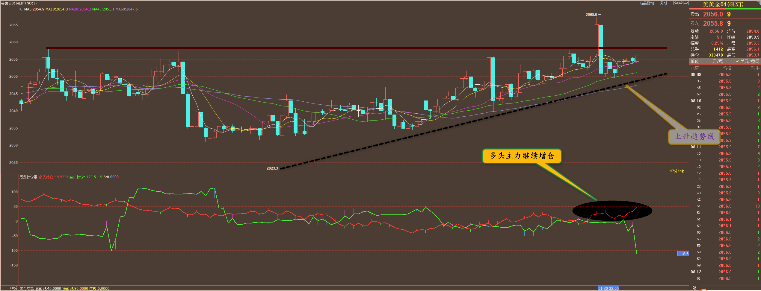通过对黄金小时图解析得知,昨日行情如期在盘中放量突破,虽然晚间又继续回到早盘的起点的位置一而再再而三目前上方2043一线依然是重要关口一旦再次放量突破并且站稳三天以上行情就会继续进一步的加速上行,短期下方我们重点关注上升趋势线的支撑警惕盘中峰回路转,我们从下方的附图可以清楚的看到昨日晚间行情在回落的过程中多头主力不断的增仓,小妹认为进一步上涨突破的可能性更大一点,短期在操作上我们继续高空低多思路,重点逢低做多,具体建议如下:
