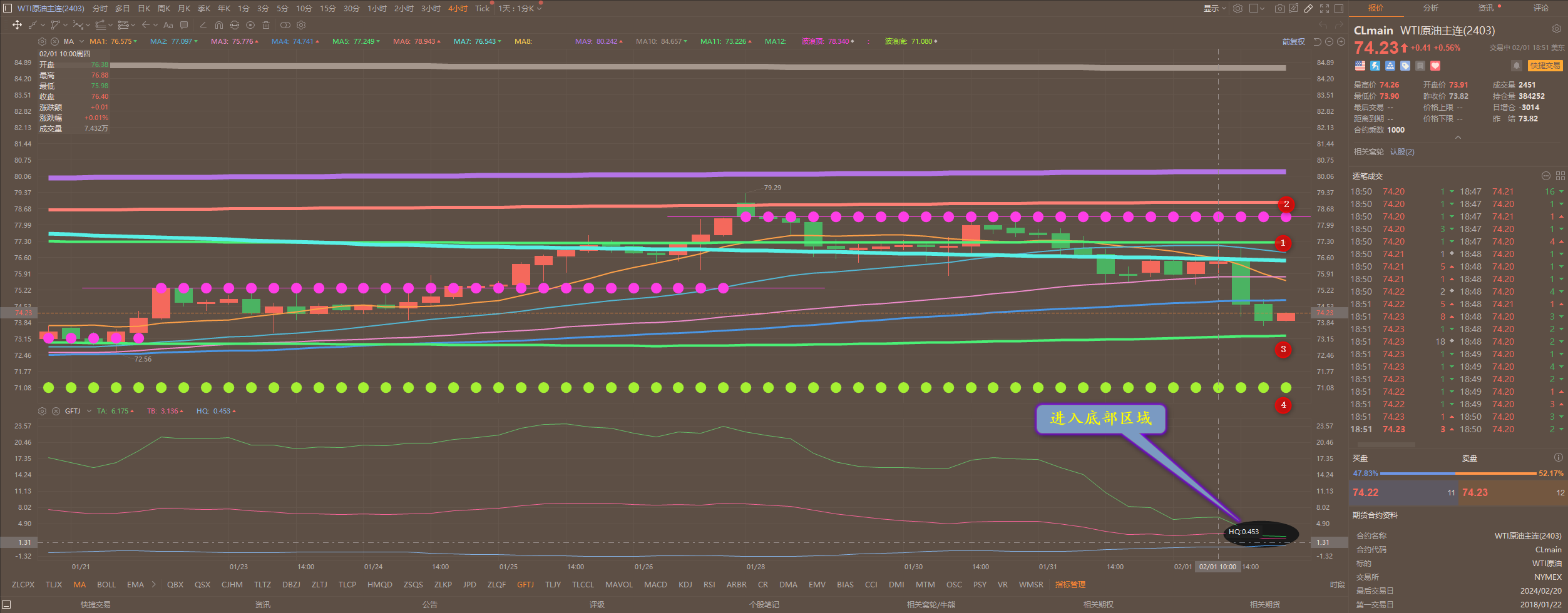 通过对原油4小时图解析得知,昨日行情先涨后跌晚间反弹至上方1号均线的压力位受阻回落目前在下方73.80一线小幅反弹,我们从下方的附图可以清楚的看到目前已经开始进入底部区域不过目前还没有出现止跌现象。短期下方我们重点关注34号的支撑。上方我们继续关注12号的压力。短期继续回落调整的可能性比较大一点,在操作上我们继续高空低多思路,具体建议如下: